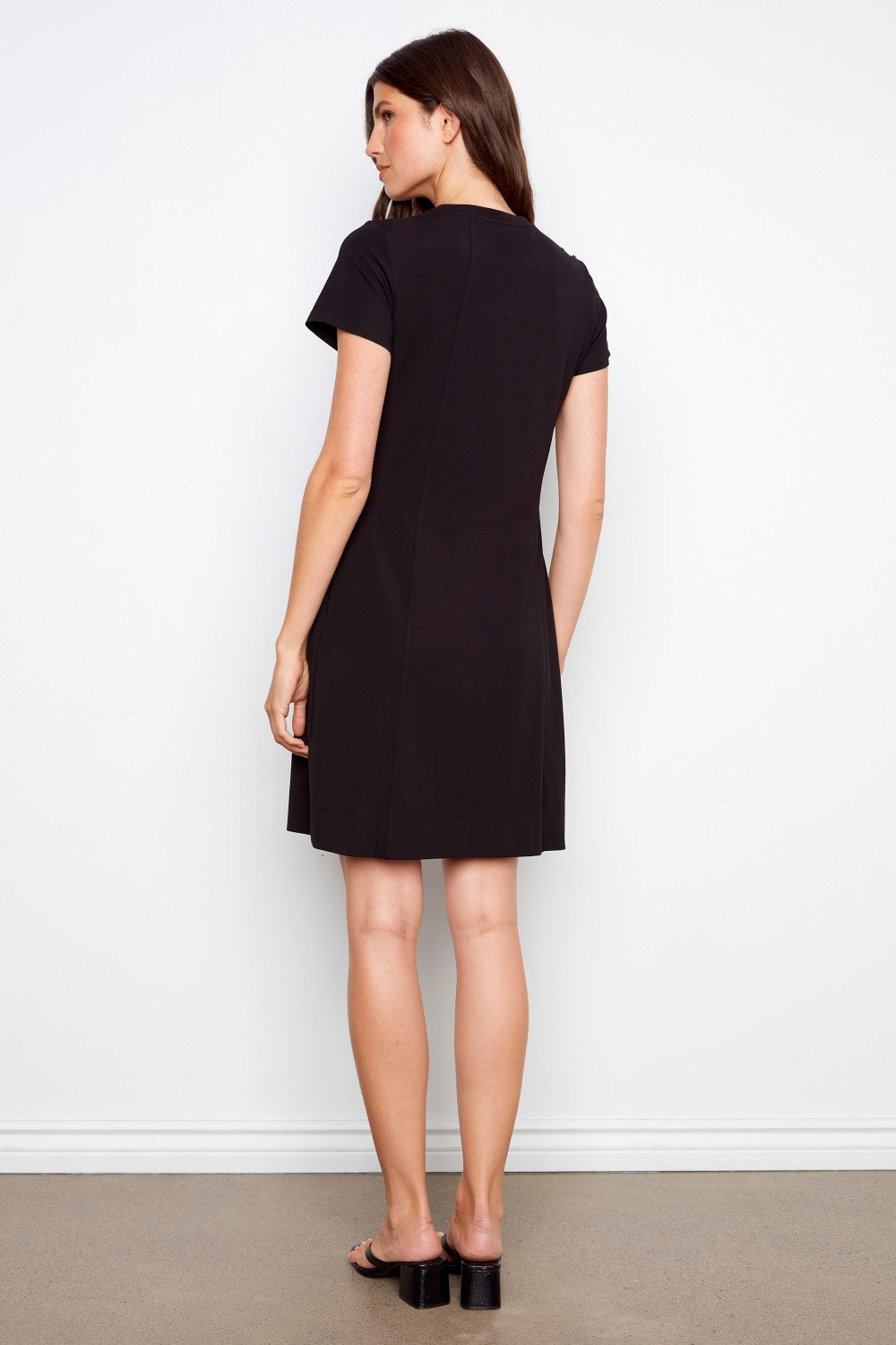 Dieses knielange Kurzarmkleid von Charlie B in Schwarz besticht durch seinen weichen Interlock-Strickstoff mit glattem, strukturiertem Griff. Mit schrägen Eingrifftaschen an der Hüfte , einem Rundhalsausschnitt und einer Rückenlänge von 94 cm bietet es eine klare, moderne Silhouette, die sich perfekt für den Übergang vom Tag zum Abend eignet.