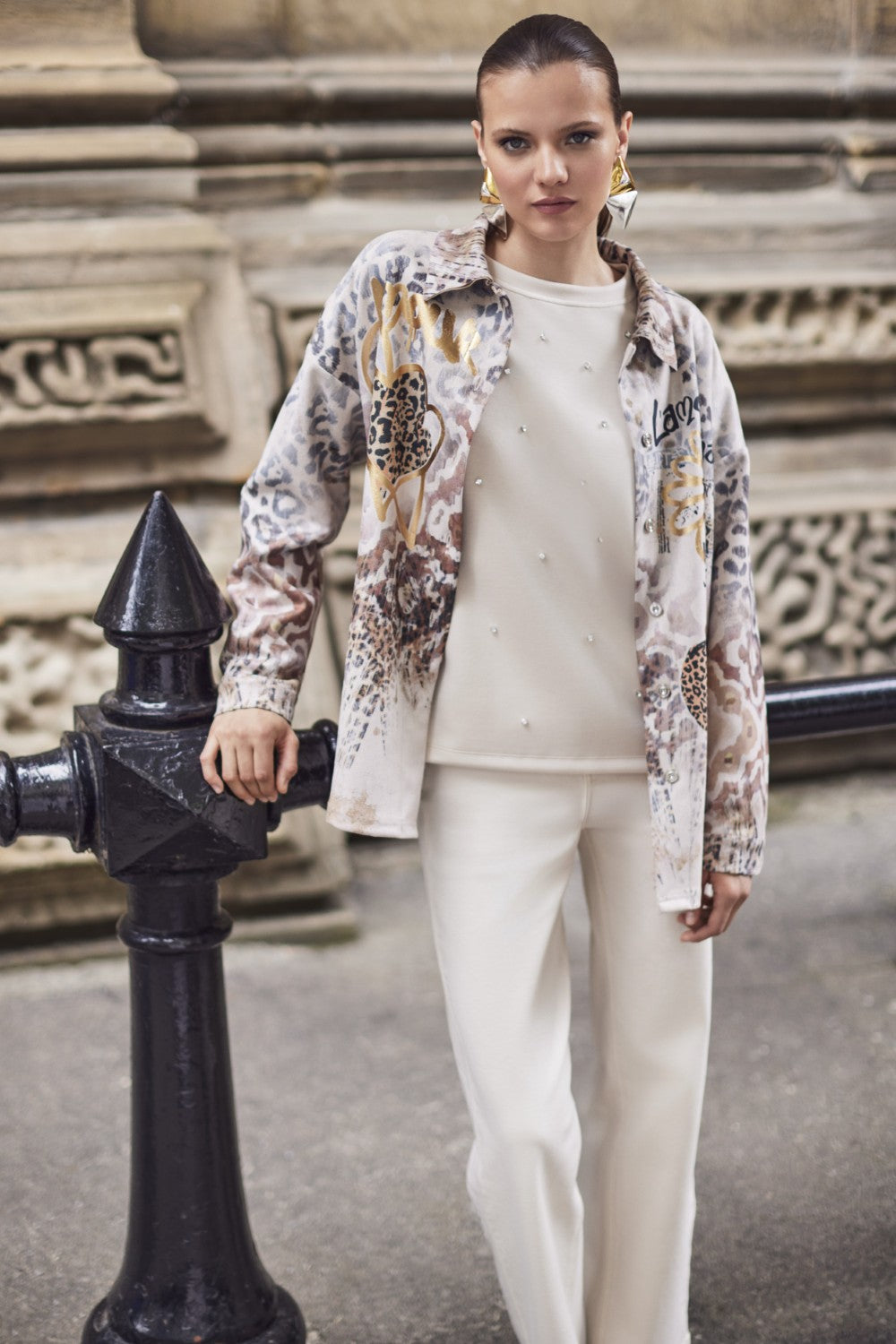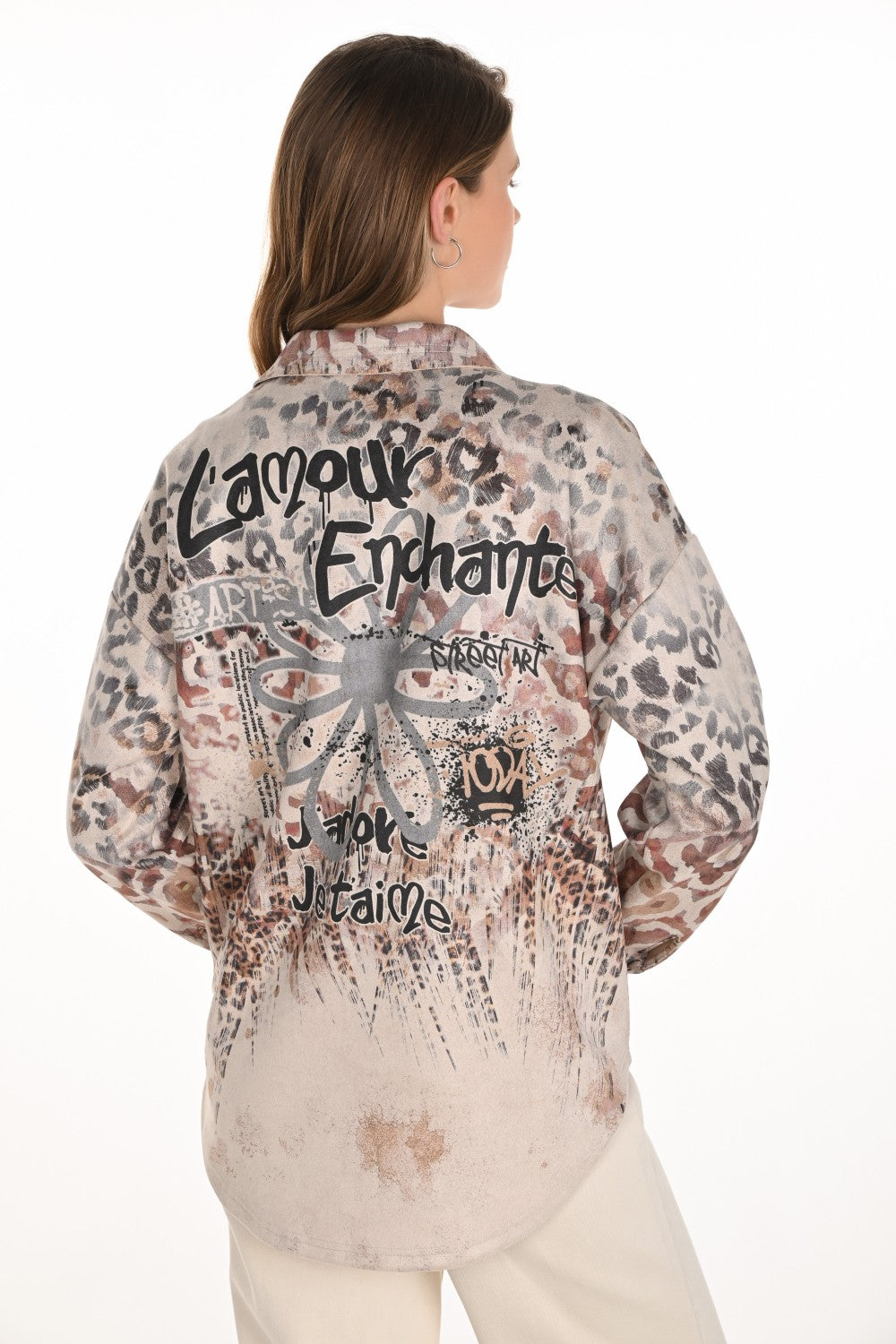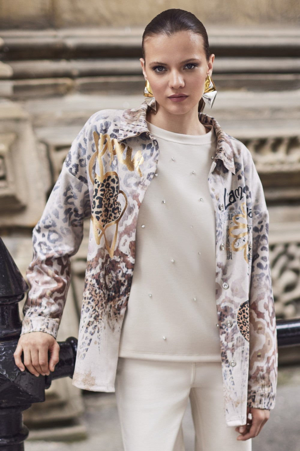 Frank Lyman Blouse 254934 Beige/Gold – Woven Shirt with Graphic and Leopard Heart Detail