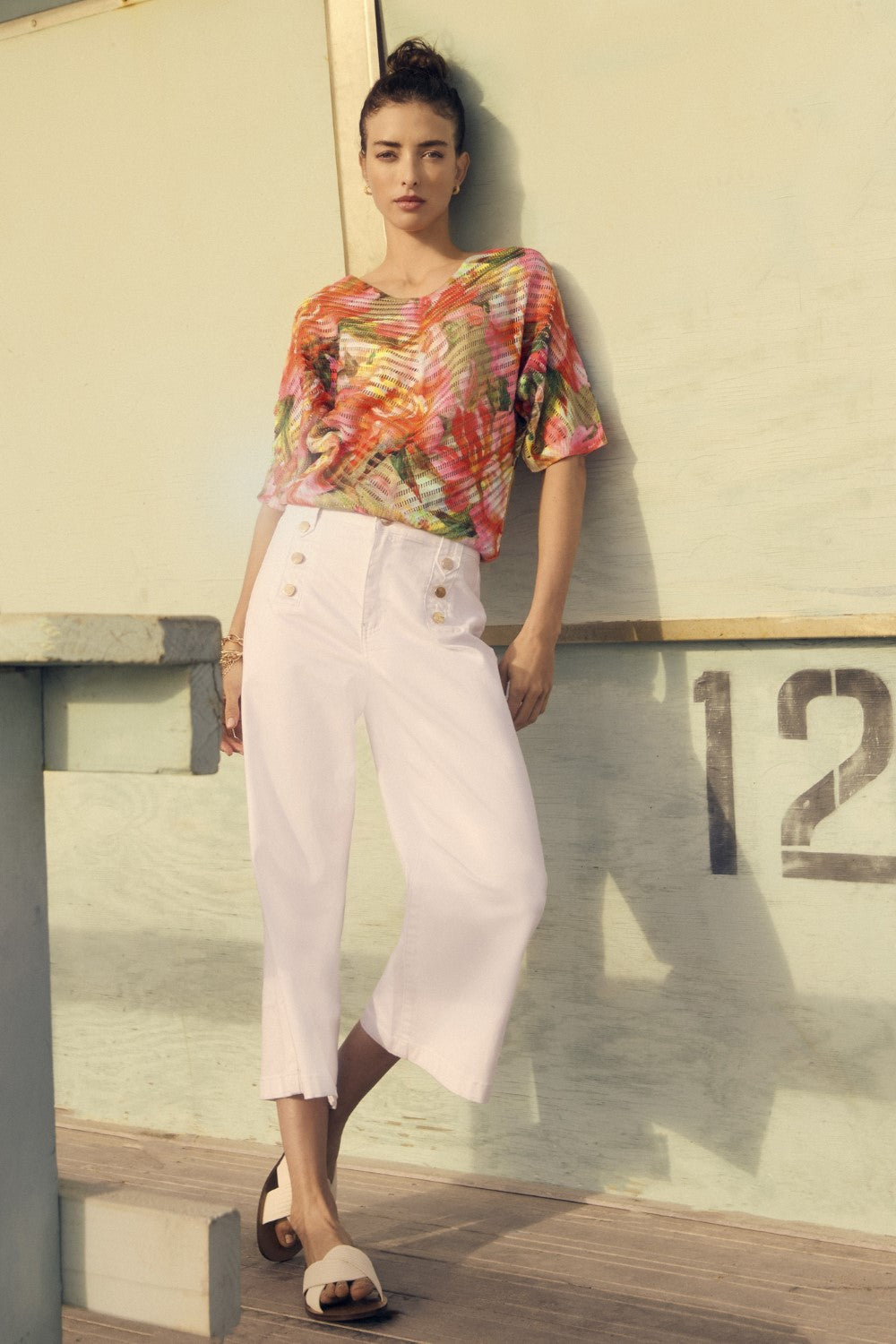 This Frank Lyman pullover blends casual ease with feminine detail. Crafted in a lightweight, slightly sheer knit, the top features a v-neckline, puff short sleeves, and a relaxed hip‑length silhouette. A vibrant floral and abstract print gives it seasonal energy, perfect for summer office days or a dressed‑down weekend look.
