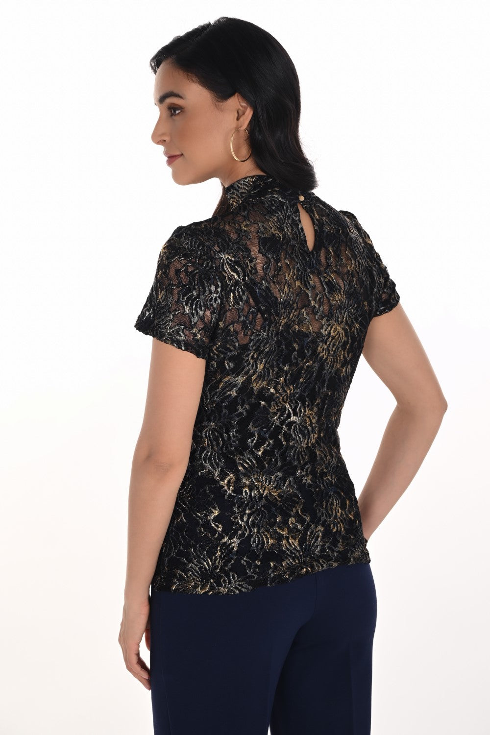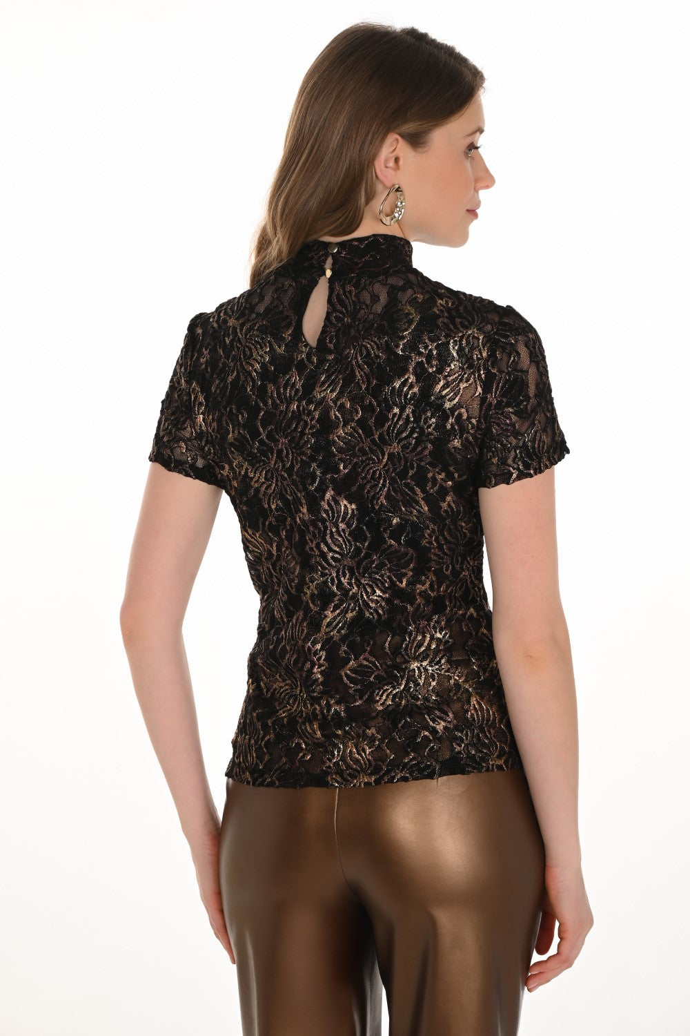 Turn heads with the Frank Lyman Top 254321, a fitted pullover that exudes effortless glamour. Designed with a high neckline, short straight sleeves, and hip-length cut, this elegant knit piece is adorned with jewel embellishments, lace details, and sheer floral patterns for a sophisticated yet modern appeal. Perfect for evening, party, or formal occasions, this top offers a chic blend of refinement and style.