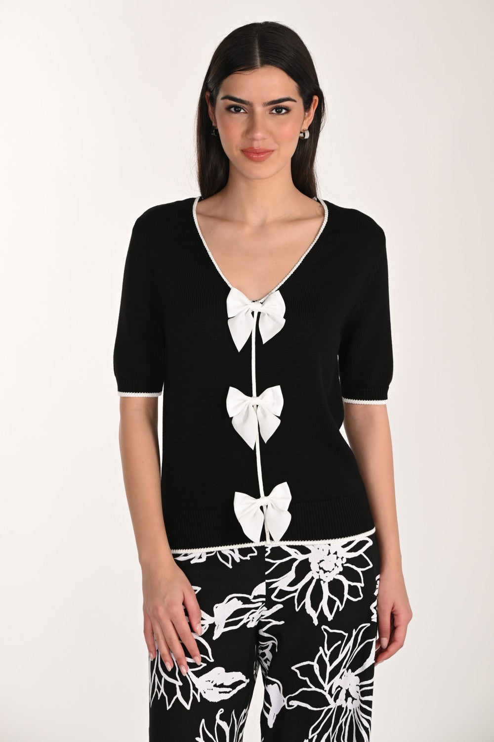 Dieser V-Ausschnitt-Pullover ist ideal für Frauen, die mühelose Eleganz lieben. Er eignet sich perfekt für legere Treffen, Dates tagsüber, entspannte Abende oder halbformelle Anlässe, bei denen Sie gepflegt aussehen möchten, ohne sich zu sehr anzustrengen. Die Baumwoll-Modal-Mischung sorgt für atmungsaktive Weichheit und macht ihn zur idealen Wahl für warme Tage – perfekt für alle, die leichte, hautfreundliche Oberteile bevorzugen. Die kurzen, geraden Ärmel und die hüftlange Silhouette zaubern eine schmeichelhafte, unkomplizierte Figur, während die Schleifenverzierungen dem schlichten Schwarz-Weiß-Design eine feminine Note verleihen. Wenn Sie ein vielseitiges Oberteil suchen, das sich wunderbar mit Jeans, Röcken oder eleganten Hosen kombinieren lässt, ist dieses Modell die perfekte Ergänzung für Ihre Alltagsgarderobe.