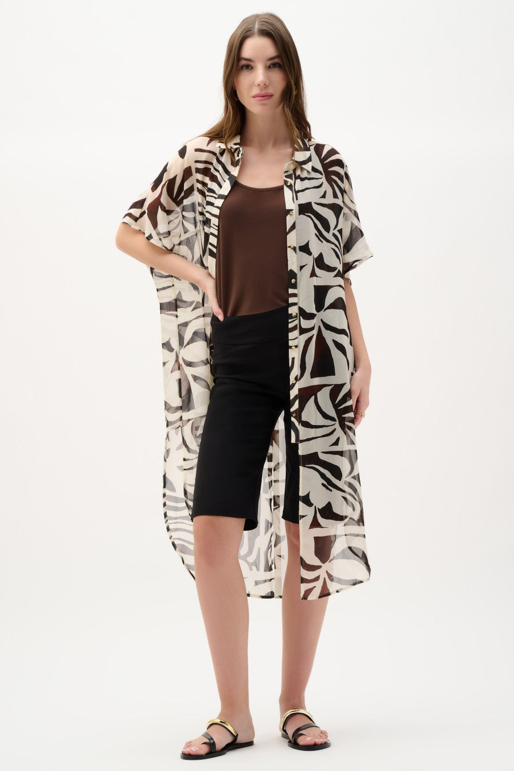 Diese Chiffonbluse mit tropischem Print ist wie geschaffen für Frauen, die lässige Eleganz mit einer lebendigen Persönlichkeit lieben. Sie verleiht warmen Tagen mühelose Bewegungsfreiheit und einen stilvollen Look. Der leichte Chiffon fällt wunderschön, ohne einzuengen, und die gerade Silhouette sorgt für eine entspannte und schmeichelhafte Passform. Goldfarbene Knöpfe setzen Akzente, und die kurzen Dolmanärmel verleihen der Bluse eine weiche Struktur. Der abgerundete Saum mit seitlichen Schlitzen sorgt für einen fließenden Fall und macht diese Bluse ideal für Urlaub, Brunch, entspannte Abende im Resort oder gehobene Freizeitkleidung.