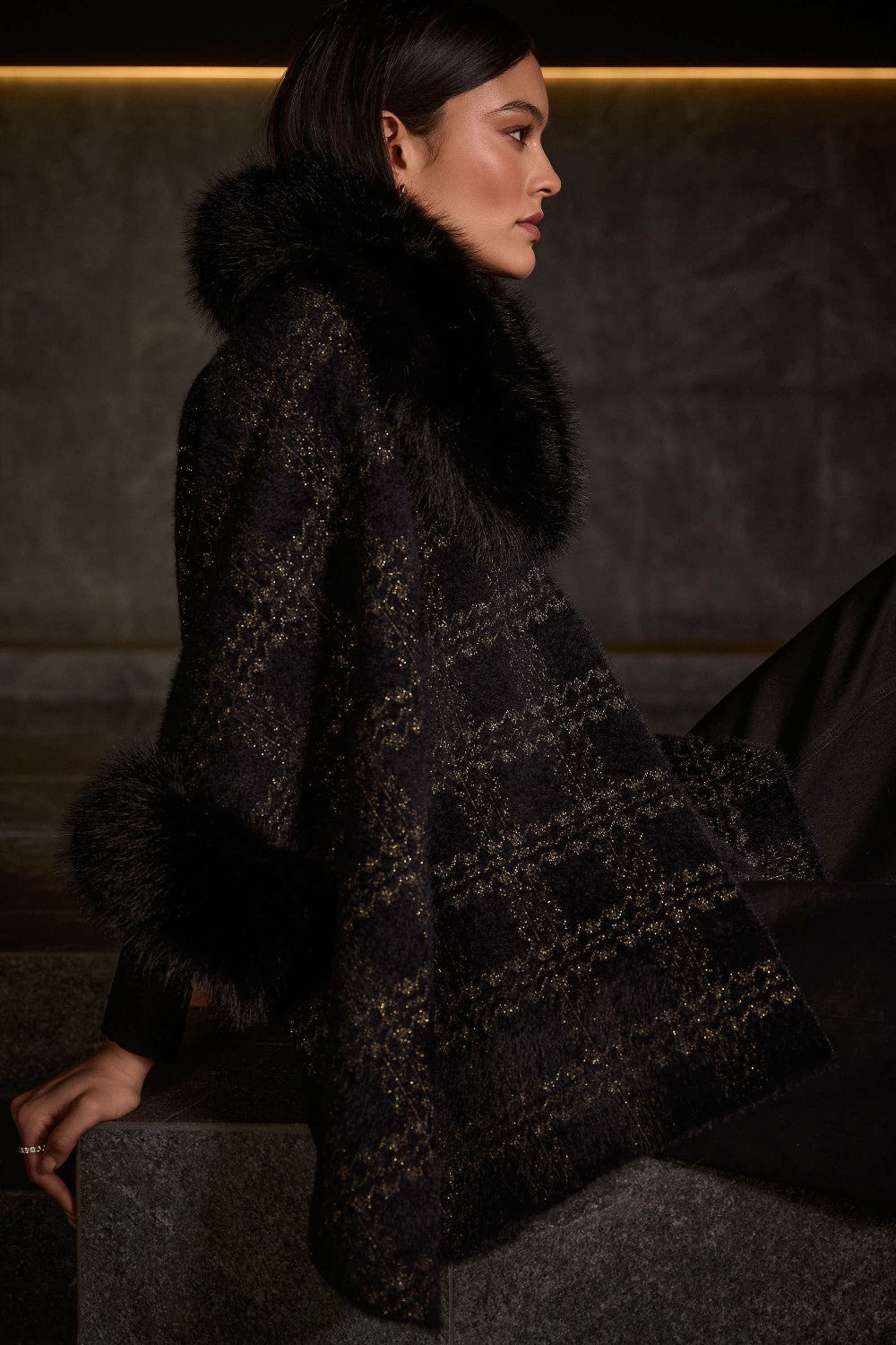 Joseph Ribkoff Cape 254934 Black/Gold – Jacquard Knit Cape with Faux Fur Accents