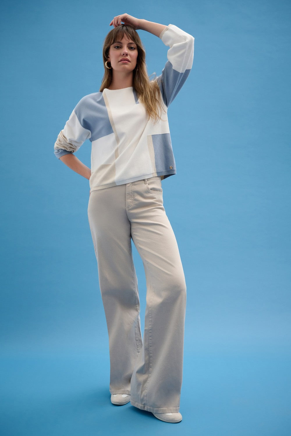Joseph Ribkoff Sweater 261998 Winter White/Birch/Chambray – Brushed Viscose Yarn Color Block Sweater