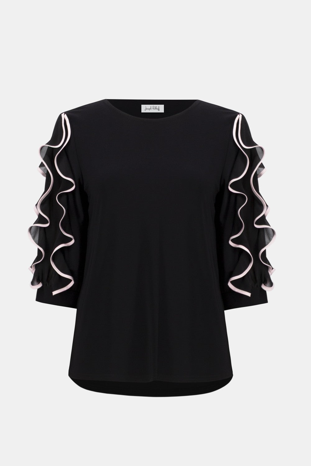 Joseph Ribkoff Top 261009 Schwarz/Zartrosa — Seidiges Stricktop mit Chiffon-Rüschenärmeln