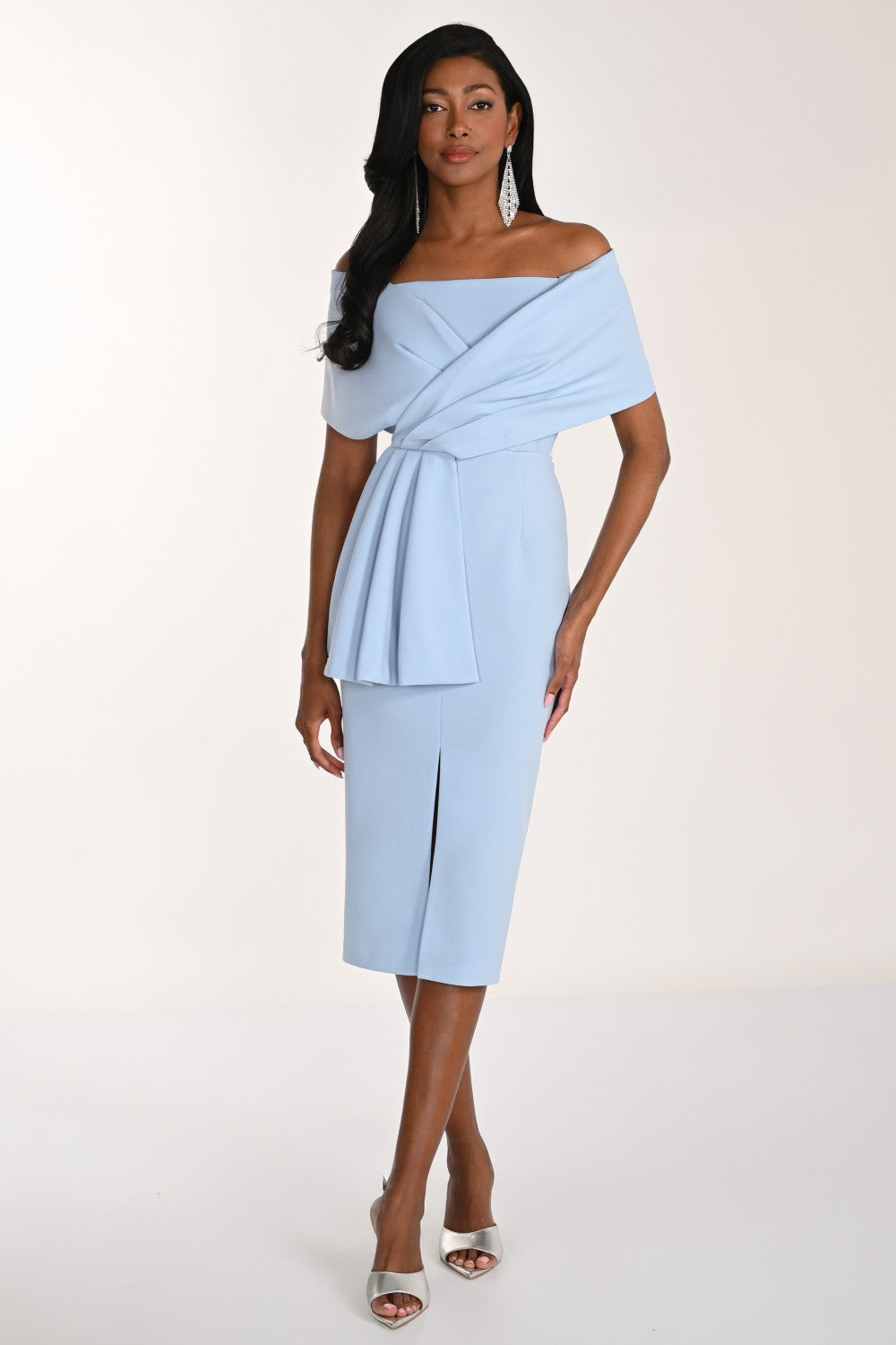 Dieses schulterfreie Etuikleid von Lyman Collection in Babyblau besticht durch seine elegante, feminine Silhouette und ist ideal für formelle und halbformelle Anlässe. Gefertigt aus einem weichen Polyester-Elastan-Strickstoff , zeichnet es sich durch einen schulterfreien Ausschnitt , Puffärmel , einen Taillengürtel , Raffungen und einen Schlitz für mehr Bewegungsfreiheit und Eleganz aus. Das vollständig gefütterte Kleid mit Reißverschluss am Rücken vereint Struktur, Komfort und Raffinesse in einem wunderschön designten Kleidungsstück.