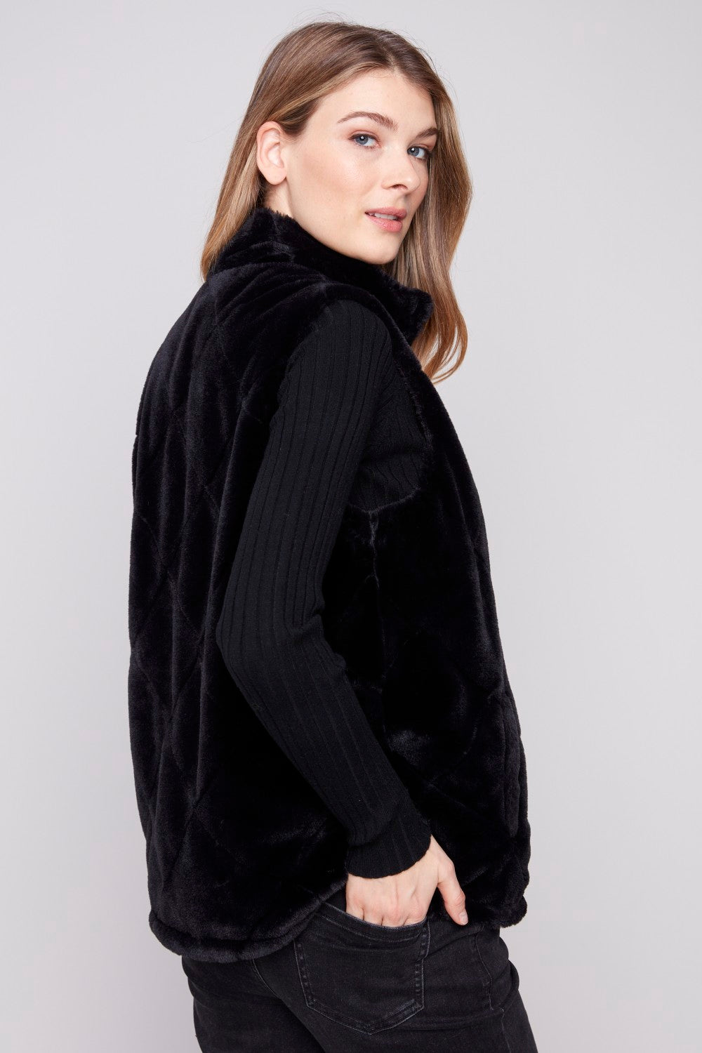 This Charlie B reversible quilted faux‑fur vest in Black features a printed quilted nylon exterior, a soft faux‑fur reverse, functional welt pockets, and a flattering 26" back length. A warm, versatile layering piece for everyday wear.