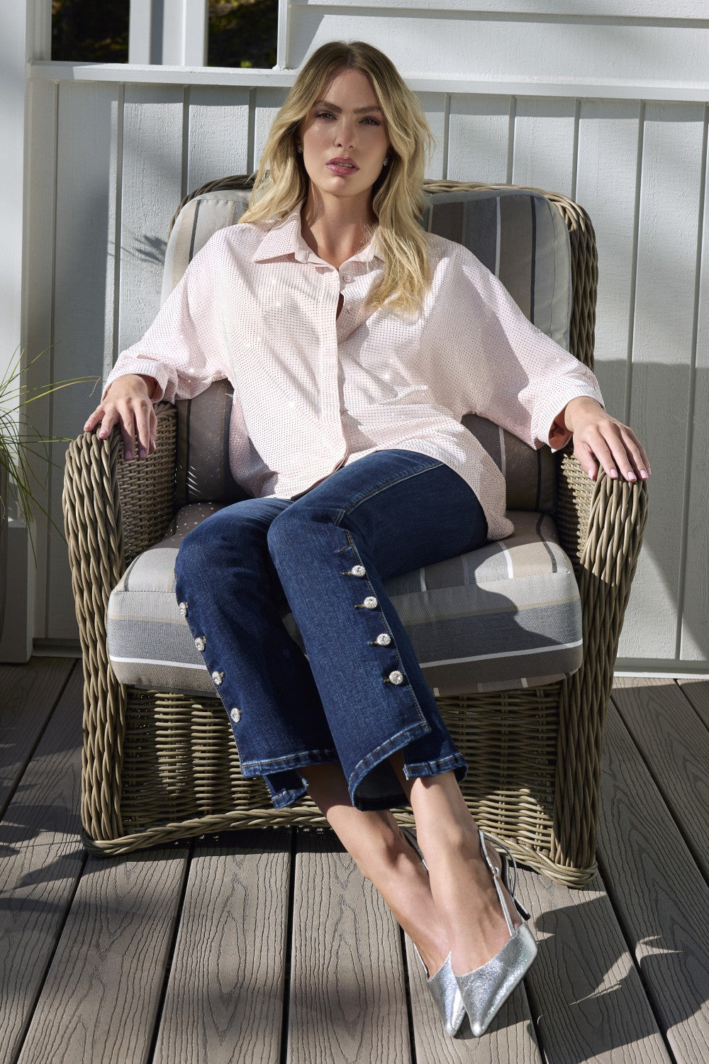The Frank Lyman Jeans (Style 266508) in Dark Blue are the ultimate wardrobe staple, combining timeless denim appeal with modern sophistication. Designed with a high‑waisted slim fit and full‑length silhouette, these jeans deliver both comfort and style. Featuring buttoned embellishments, front and back pockets, and a classic zipper closure, they are versatile enough for casual outings, semi‑formal occasions, or elevated everyday wear.