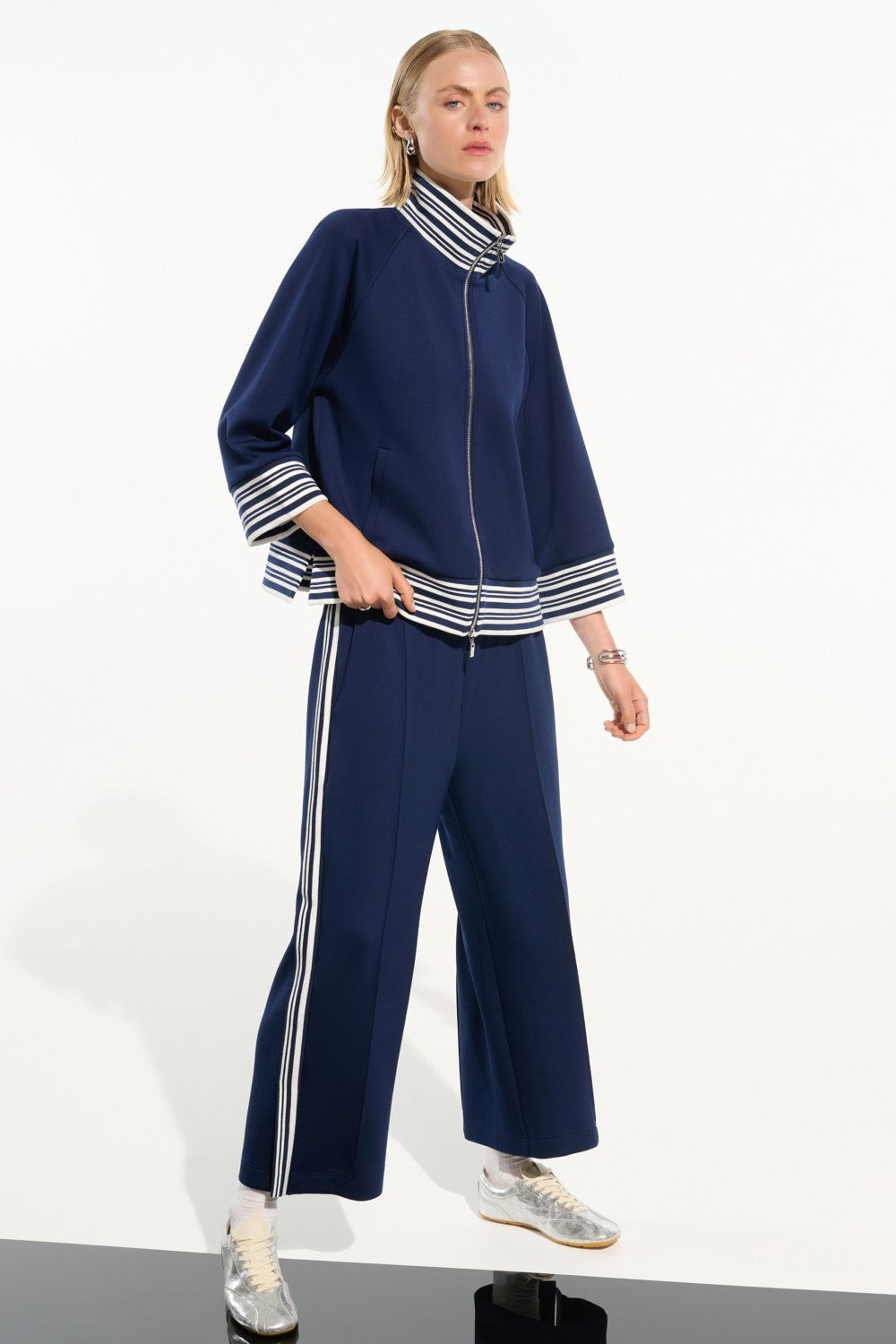 This Joseph Ribkoff scuba jersey jacket in Indigo/Vanilla features a soft, structured scuba jersey fabric with a sporty‑chic aesthetic. Designed with a funnel collar, striped rib trim, three‑quarter raglan sleeves, and a metallic front zipper, it delivers a clean, modern silhouette perfect for layering. Unlined for comfort and ease.