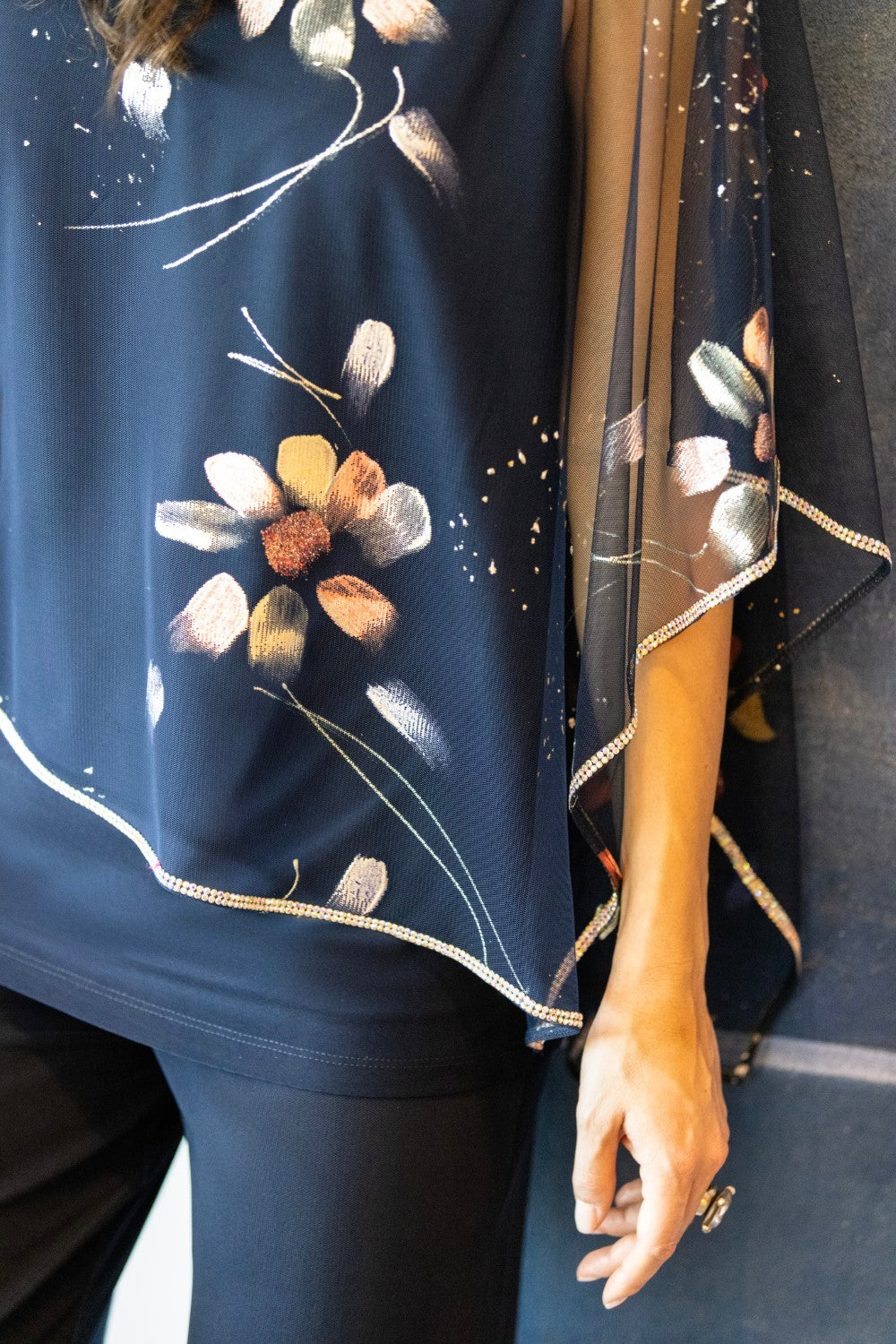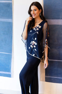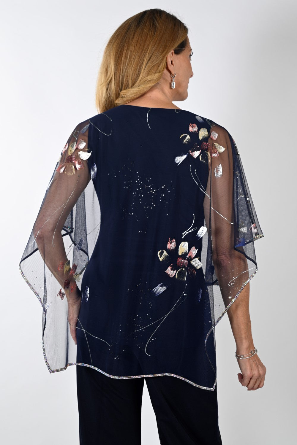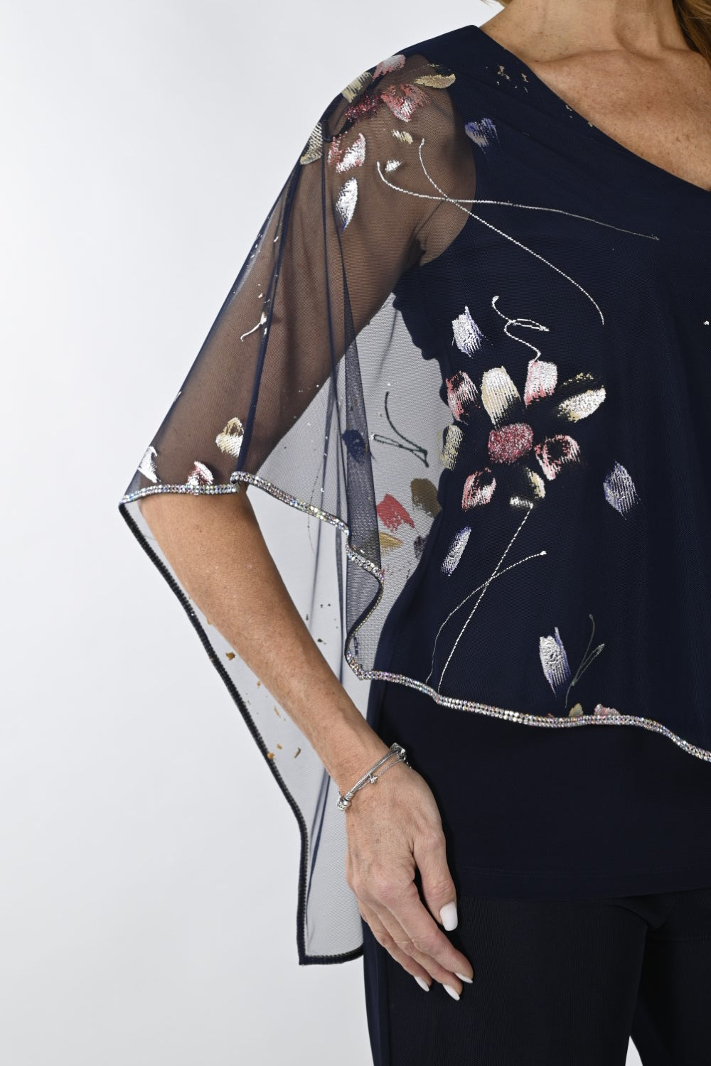 This top transcends ordinary fashion with its exquisite floral chiffon overlay that adds an enchanting layer to the design. A touch of sophistication is added with the sparkling trim that adorns the edges. The top's length, approximately 27 inches (69 cm) in size 12, complements various body types, offering a versatile choice.