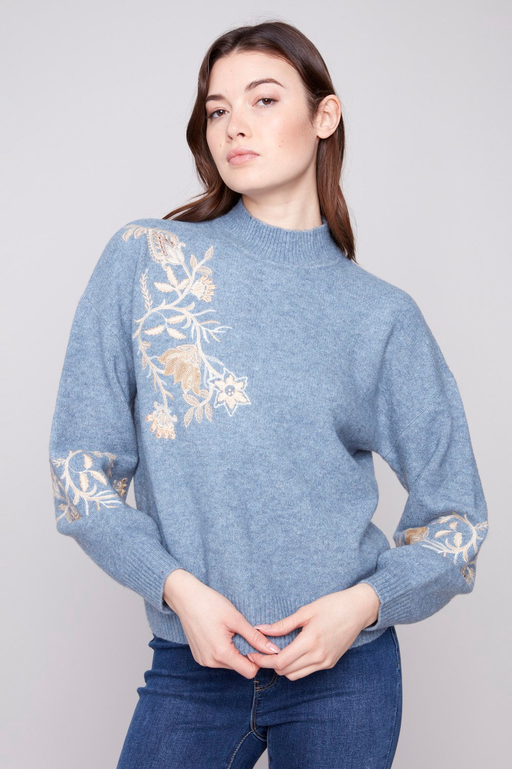 Charlie B Sweater C2856‑018C‑011 H‑Denim — Mock Neck Sweater with Sequin Detail