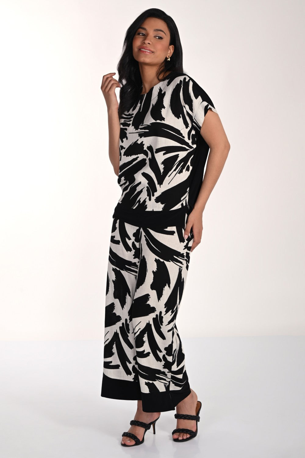 This Frank Lyman high‑waisted abstract trouser in Black/Natural features a breathable rayon‑linen woven fabric, a flattering wide‑leg silhouette, a comfortable elastic waist, and elegant slit details. Fully lined and designed with a 26" inseam, it delivers relaxed sophistication for warm‑weather dressing.