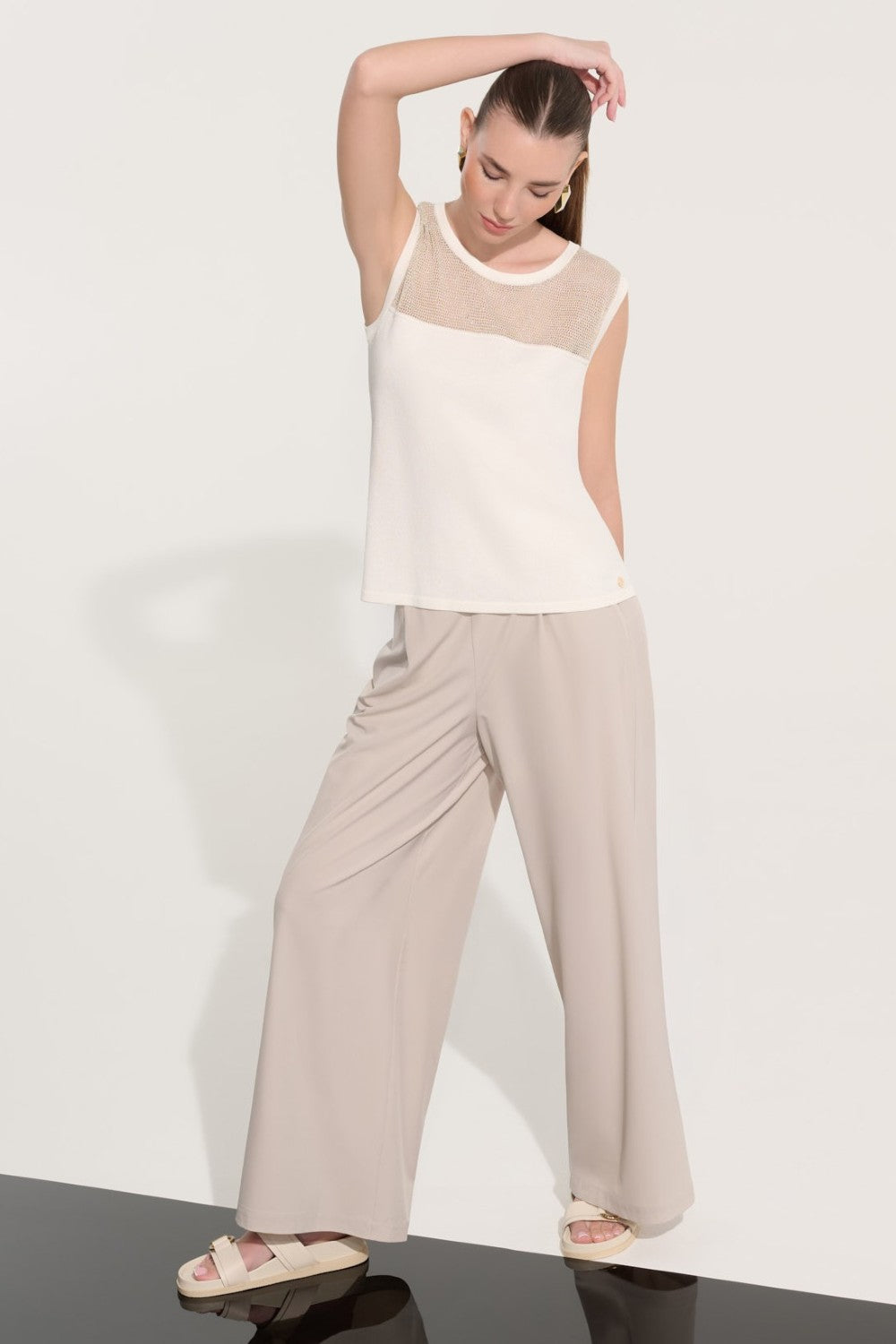 This Joseph Ribkoff soft knit cami in Vanilla/Gold blends comfort with contemporary detailing. Crafted from a lightweight viscose‑nylon knit, it features a crew neckline, sheer mesh yoke, and a straight, sleeveless silhouette. Unlined and breathable, it’s perfect for layering or wearing solo during warmer seasons.