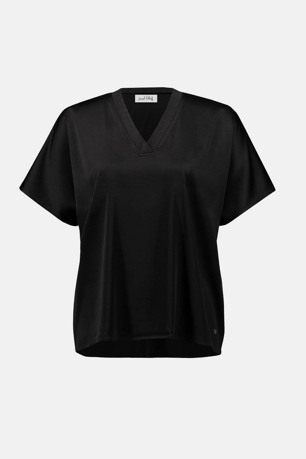 Experience elevated simplicity with this effortlessly chic satin boxy top by Joseph Ribkoff. Designed in a soft, lightweight woven satin, it features a flattering V-neckline, short dolman sleeves, and a relaxed boxy silhouette that drapes beautifully. Ribbed trim detailing at the neckline and sleeve hems adds a refined textural contrast. Whether worn on its own or layered under a blazer or cardigan, this top delivers understated elegance with maximum versatility.
