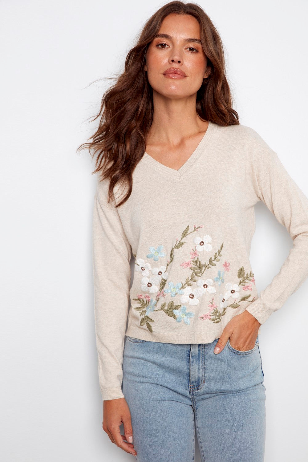 This Charlie B embroidered V‑neck sweater in Wildflowers is crafted from soft 100% cotton with appliqué embroidery on the front body. Designed with long sleeves, a V‑neckline, and a 23" back length, it offers a comfortable, easy silhouette perfect for everyday wear.