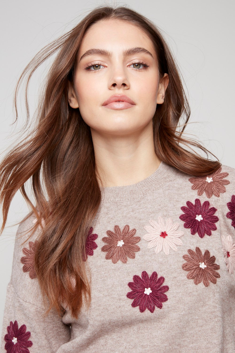 This Charlie B floral embroidery crew neck sweater in H‑Taupe features a soft rayon‑poly‑nylon knit, delicate embroidered floral detailing, long sleeves, and a comfortable 23" back length. A cozy, stylish knit ideal for everyday wear.