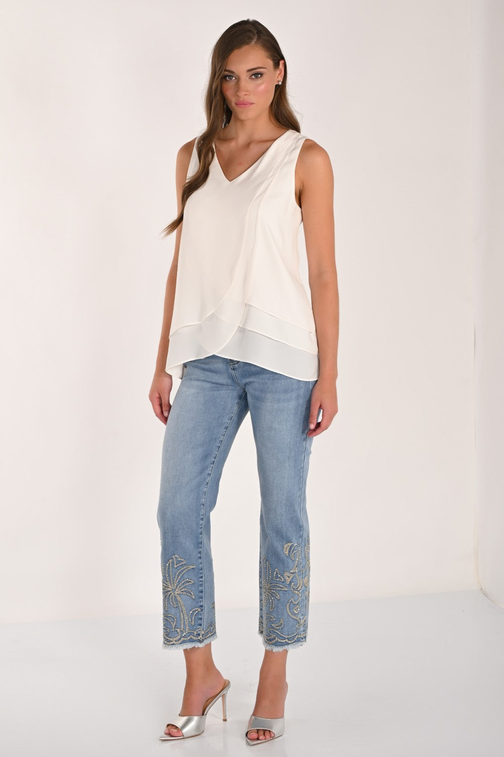 These Frank Lyman floral cropped jeans in Blue bring a bold, modern twist to classic denim. Designed with a comfortable mid‑rise and a straight‑fit silhouette, they offer effortless movement while maintaining a flattering shape. The standout floral embroidery adds artistic flair, while frayed hems and decorative buttons give the jeans a trendy, fashion‑forward edge. Perfect for casual summer outings, weekend strolls, or pairing with your favorite tees and blouses, these jeans are ideal for women who love denim with personality and style.