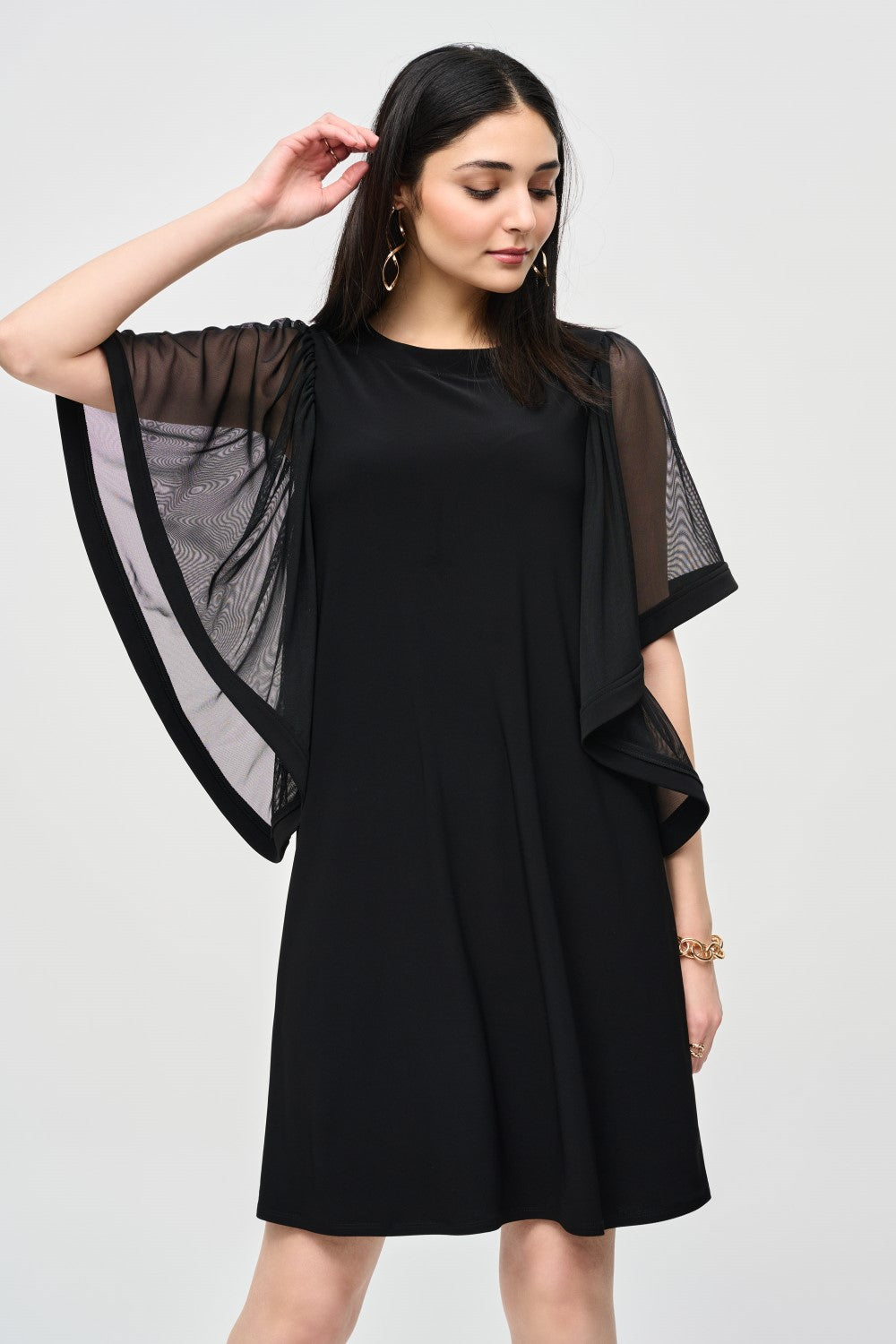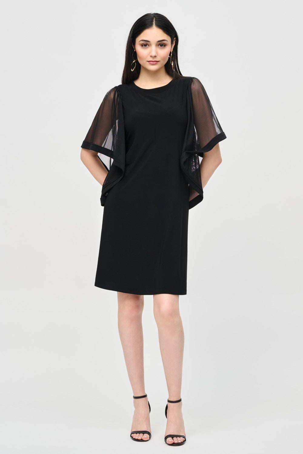 Presentazione dell'abito Joseph Ribkoff 243272, un sofisticato abito da maglia setosa e trapezio in maglia disponibile in sorprendente nero e rossetto rosso. Realizzato da una miscela di poliestere al 96% e 4% di spandex, questo abito elegante presenta una scollatura in barca aggraziata e maniche corte a farfalla adornate con shirring, aggiungendo un tocco di fascino femminile. La silhouette del trapezio sfodera e sopra il ginocchio garantisce comfort e stile, mentre la comoda chiusura della cerniera posteriore lo rende facile da indossare. Questo vestito è perfetto per varie occasioni, combinando comfort, stile e facilità di movimento senza sforzo.