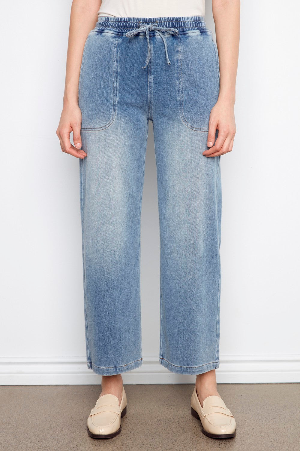 These Charlie B knit denim wide‑leg jogger pants in Medium Blue feature a soft stretch fabric, regular rise, slash pockets, and a cropped wide‑leg silhouette for modern, comfortable everyday wear.