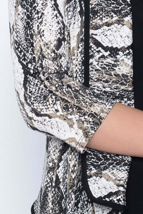 The jacket features a striking print on both the front and back, showcasing a beautiful combination of black, taupe, and ivory hues. This unique design adds a touch of elegance and modernity, making it perfect for both casual and semi-formal occasions. Whether layered over a dress, blouse, or top, this jacket adds a chic finishing touch to any outfit.