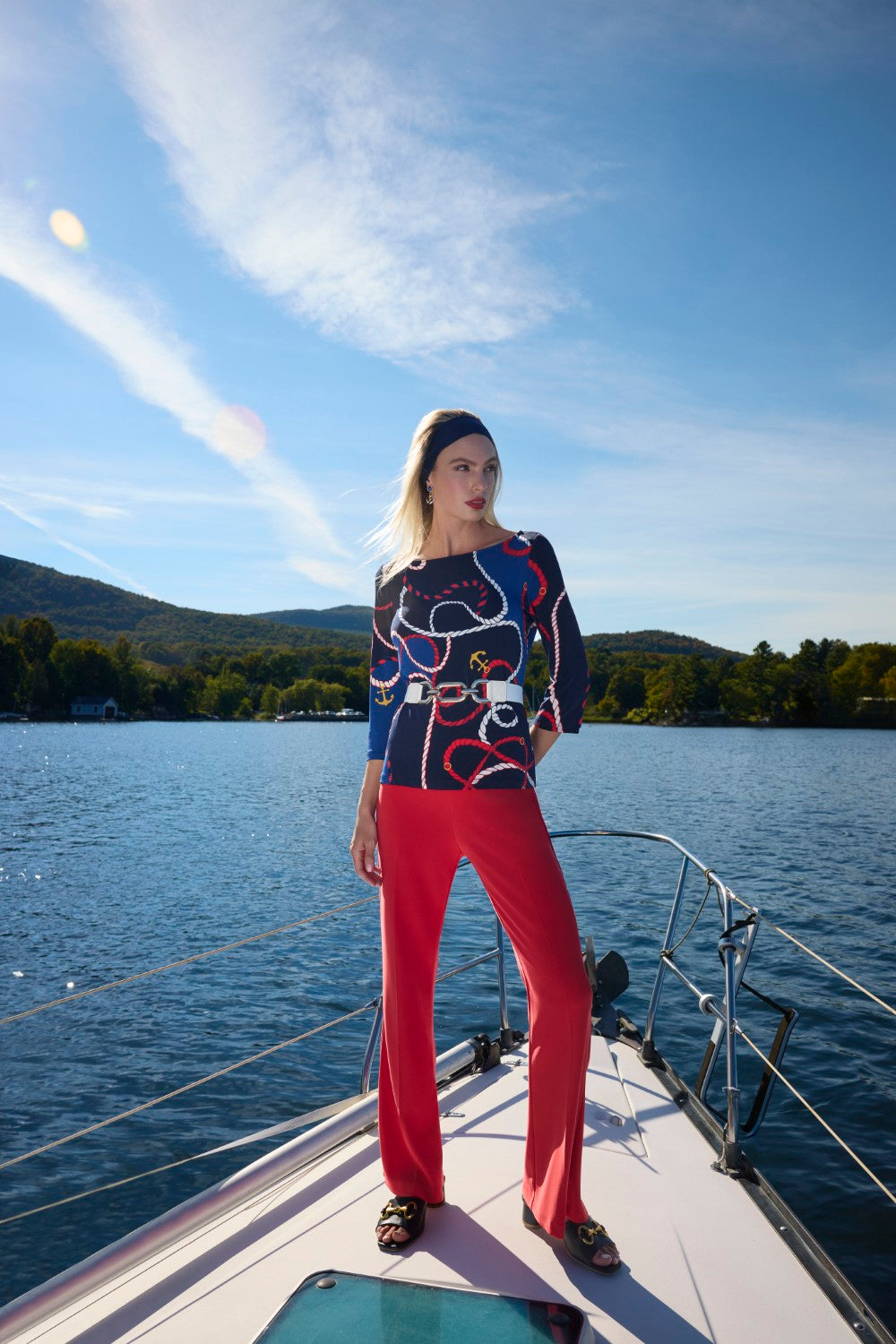 These Frank Lyman flare trousers feature a mid‑rise fit, flared silhouette, and soft stretch knit for polished, feminine style.