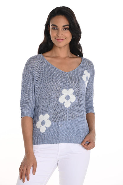 Frank Lyman 256838U – Blue/Off-White Sweater Knit Top with Refined Floral Elegance