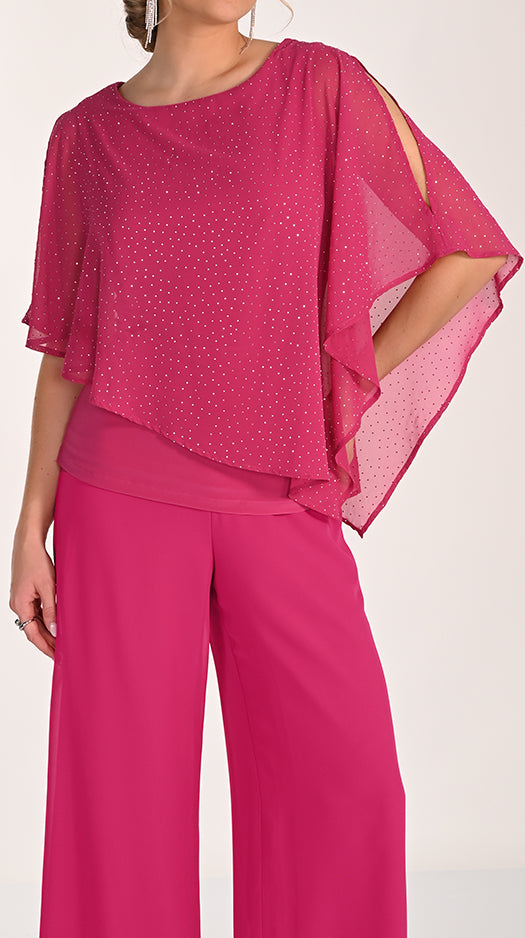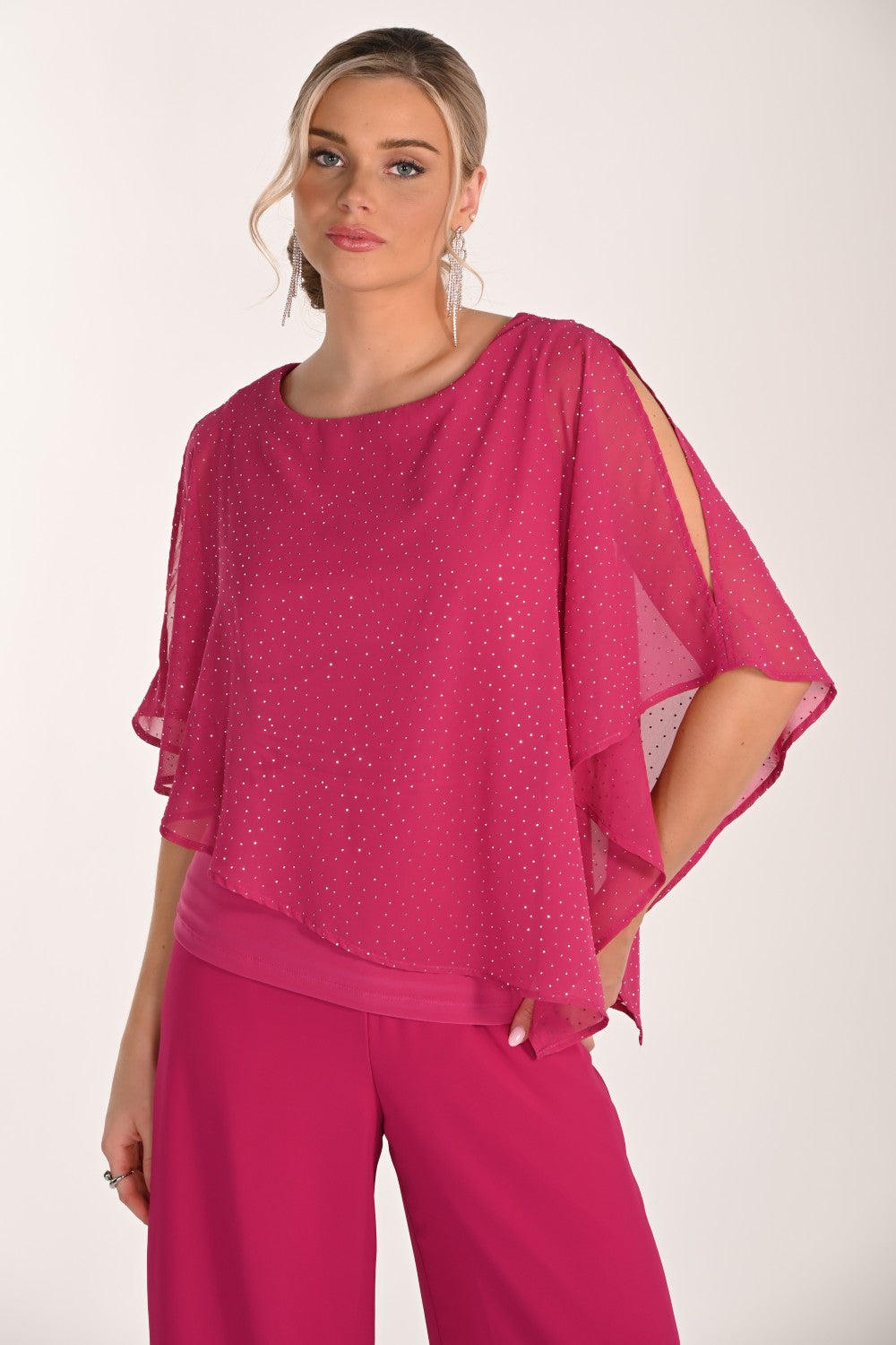 This embellished layered pullover top brings effortless glamour to any special occasion. Designed with a loose, flowing fit and a flattering hip‑length silhouette, it features a soft round neckline and a beautifully sheer layered design that drapes with elegance. Sparkling jewel embellishments add eye‑catching detail, while the delicate flutter short sleeves create graceful movement. Perfect for evening events, parties, and formal gatherings, this standout piece blends comfort with sophisticated style.