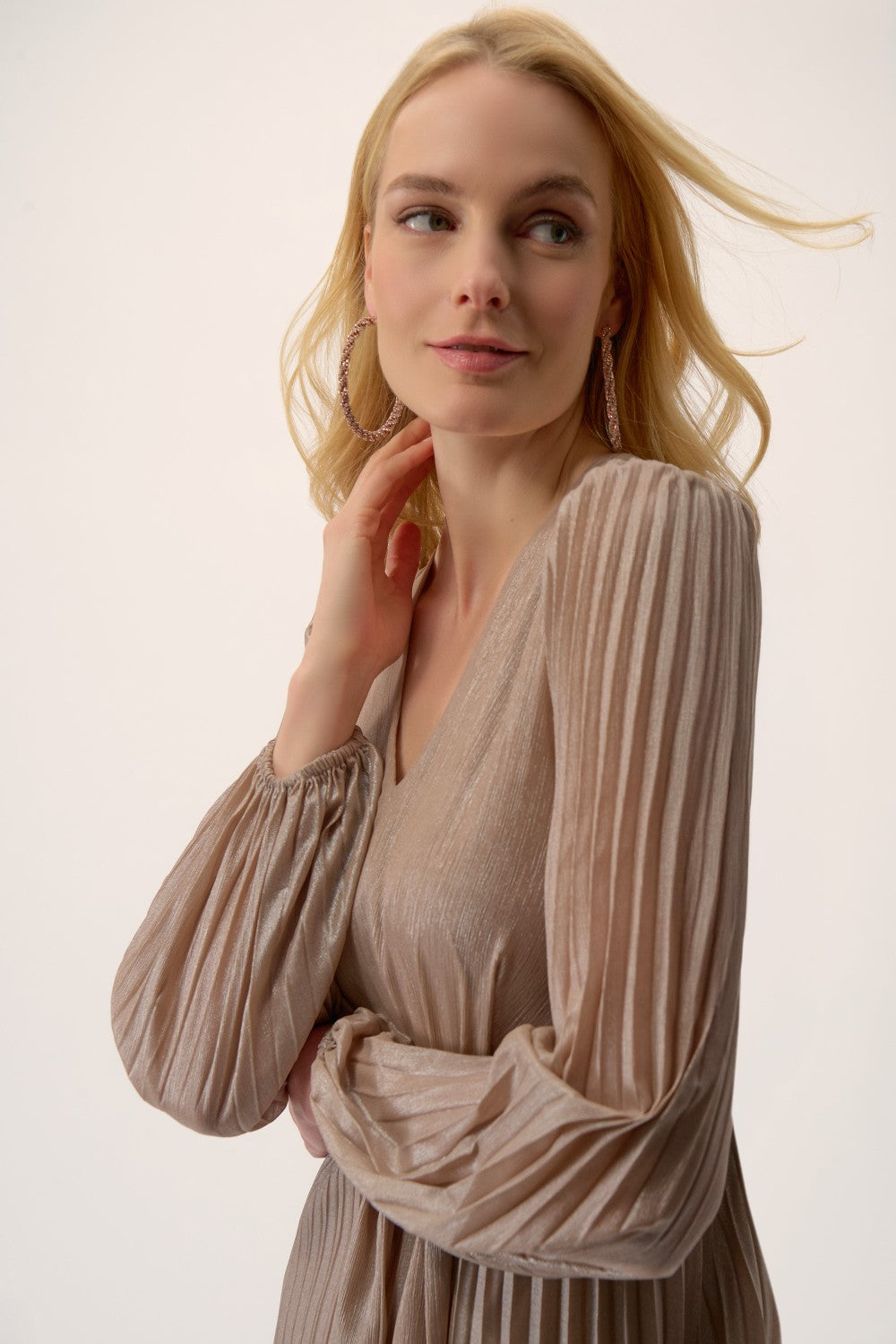Radiating timeless sophistication, the Joseph Ribkoff Foiled Chiffon Fit and Flare Dress (Style 254728) in Taupe/Silver is a graceful statement piece from the Signature Collection. Crafted from woven foiled chiffon, this lined midi dress features a V-shape neckline, long puffed sleeves, and exquisite pleating at the skirt and sleeves. A waist-defining sash enhances the fit and flare silhouette, while the ankle-grazing length adds effortless elegance—perfect for formal occasions, evening events, or seasonal celebrations.