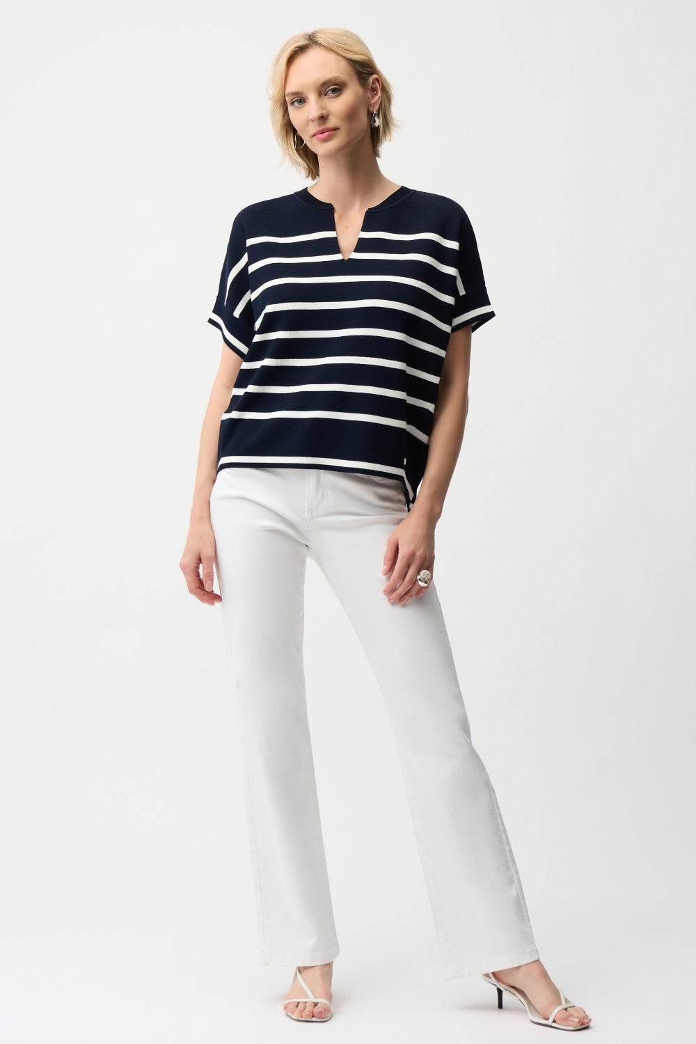 This Joseph Ribkoff striped sweater is the definition of relaxed sophistication. Crafted from a breathable dry‑viscose blend, it offers a soft, lightweight feel that’s perfect for warm days, transitional seasons, or effortless layering. The boxy silhouette drapes with ease, while the short dolman sleeves create a modern, laid‑back shape. A notched V‑neckline adds subtle structure, and the relaxed high‑low hem brings movement and versatility. Whether paired with denim for weekend outings or tailored trousers for polished casual wear, this sweater delivers comfort and style in equal measure.