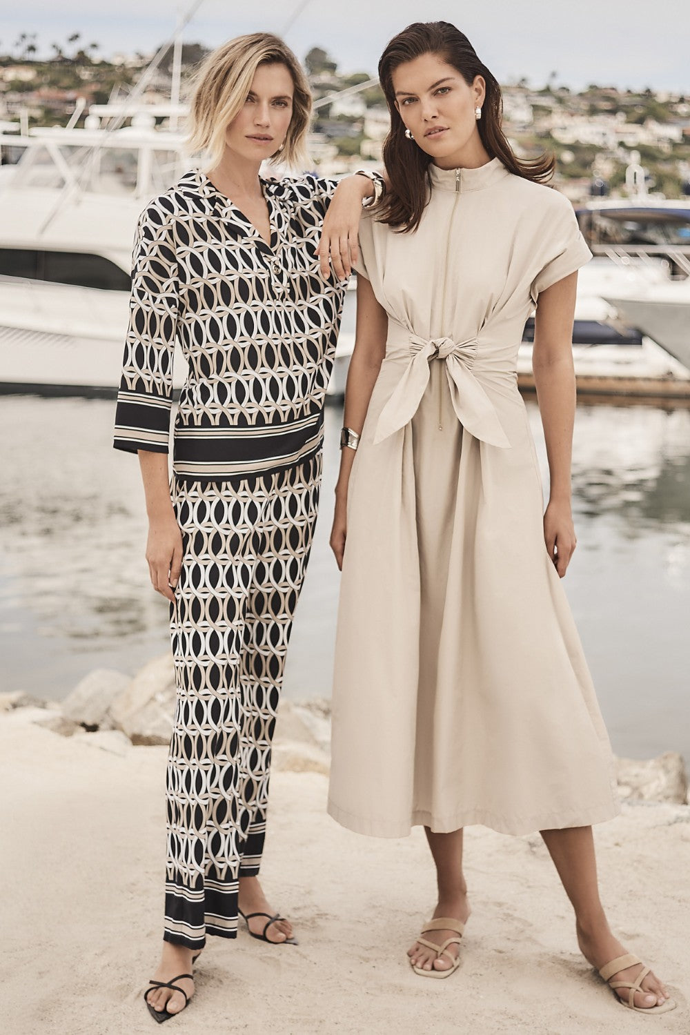 This Joseph Ribkoff geometric print top blends bold artistry with refined tailoring. Crafted from recycled woven fabric, it offers a lightweight, fluid drape that feels polished yet effortless. The luxe status‑chain border print adds a striking visual statement, while the crisp shirt collar and single‑button detail introduce a touch of structured sophistication. Three‑quarter dolman sleeves and a relaxed boxy silhouette ensure comfort and ease of movement, making this top ideal for travel, daytime outings, elevated casual wear, or pairing with tailored pieces for a chic, modern look.